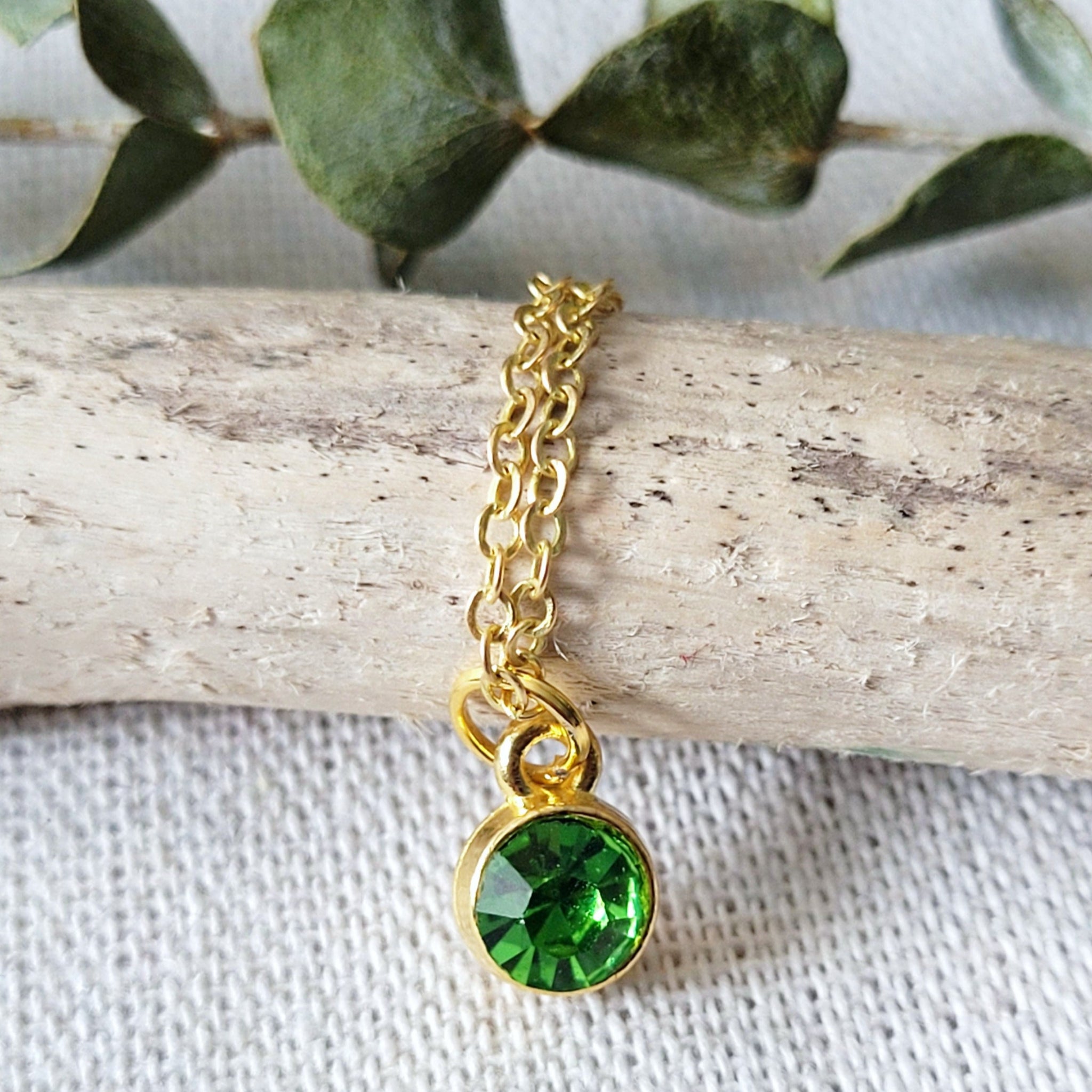 This sweet little faux peridot glass pendant is approximately 5mm in size and hangs on a gold plated chain.