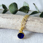 This sweet little faux sapphire glass pendant is approximately 5mm in size and hangs on a gold plated chain.